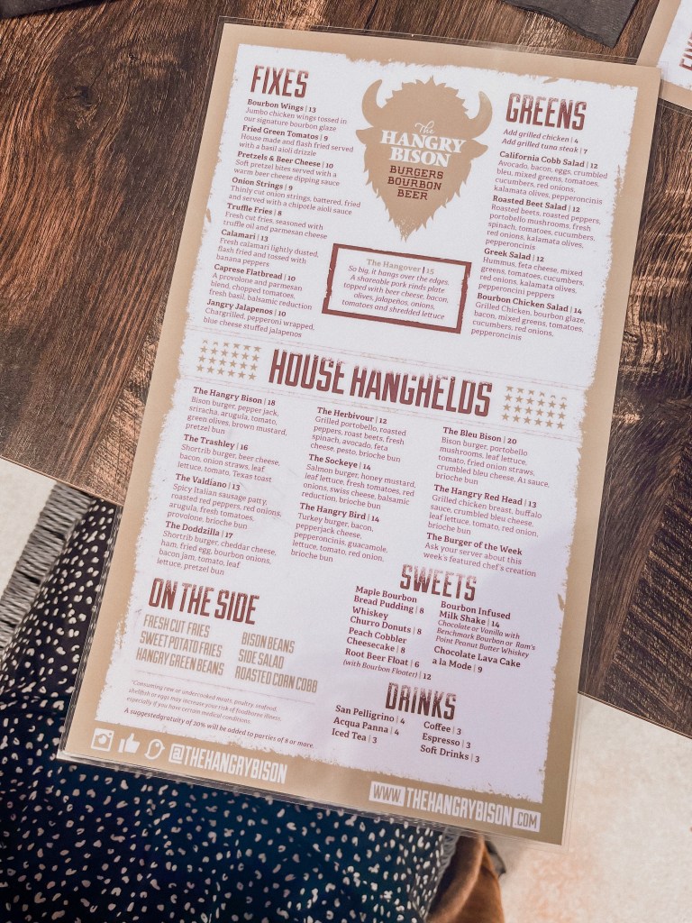 Next we had to dive into what our main meal would be. The menu consists of salads, pre-made burgers, or the option to build your own which they call Bison Builds! The pre-made burgers were also customizable so you could use them as a starting point!