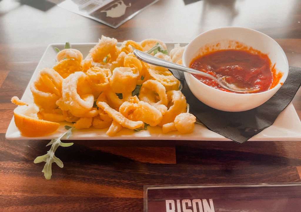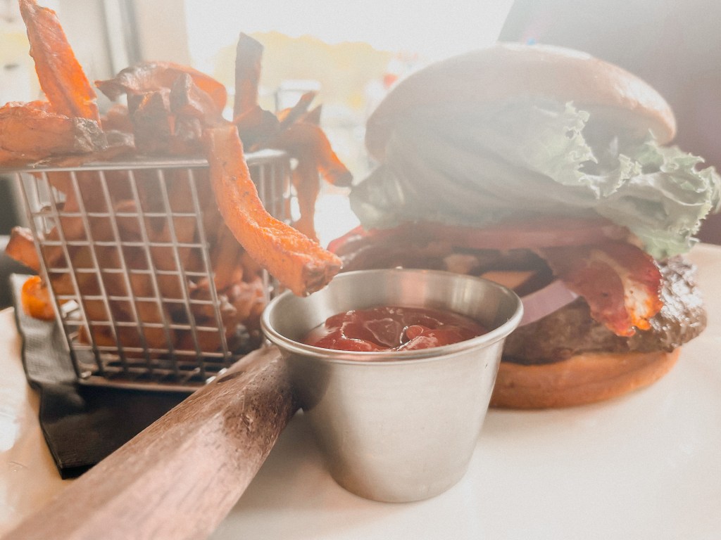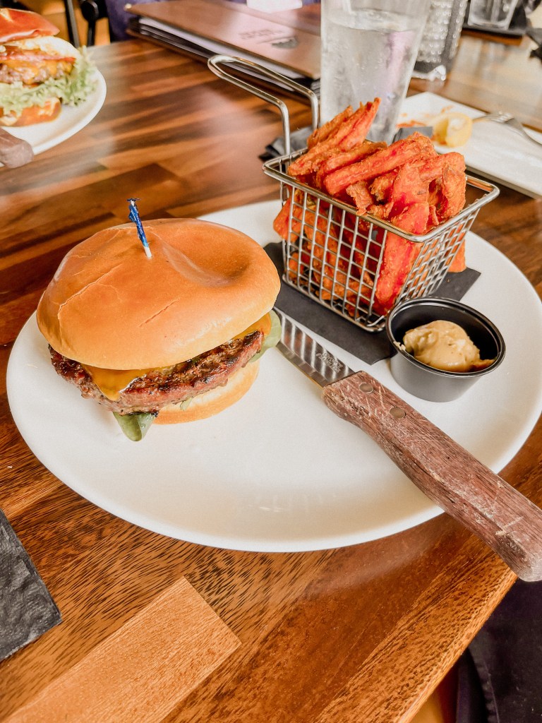 Our table enjoyed a variety of different burgers from the Dodzilla which is made up of a short rib burger, cheddar cheese, ham, fried egg, bourbon onions, bacon jam, tomato, lettuce and a pretzel bun to Bison builds with the regular Bison Burger patty, the Salmon Burger, or a Turkey burger! Each burger also comes with your choice of a side. We enjoyed delicious sweet potato fries that came with a honey butter to dip into and good ol’ fashion french fries with ketchup!